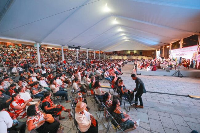 La elección se realizó en un ambiente de hermandad y fiesta en la Plaza de la Danza, el foro de cantera verde abarrotado por cientos de asistentes que aplaudieron y festejaron con orgullo a las mujeres que son muestra de la fortaleza de sus pueblos.