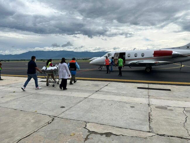 OAXACA DE JUÁREZ, Oaxaca.- Los Servicios de Salud de Oaxaca (SSO) y la Dirección del Hangar Oficial del Gobierno del Estado activaron el protocolo de emergencia para el traslado aéreo de una paciente de 69 años con quemadura de segundo grado en 28.9 por ciento de su superficie corporal.